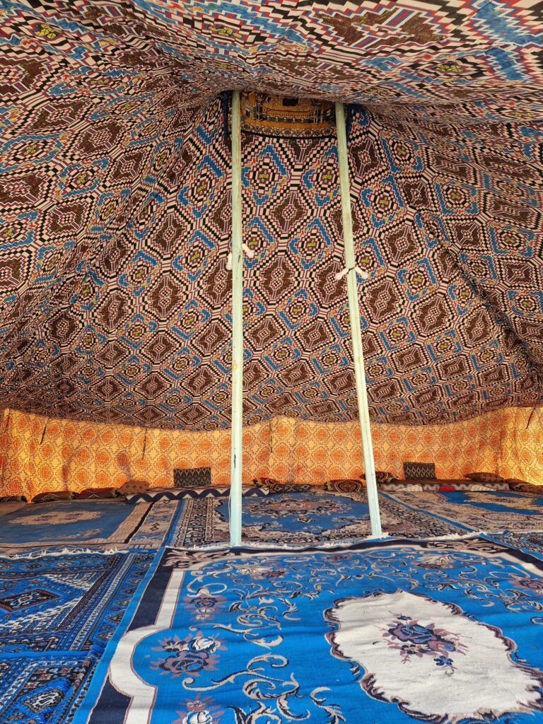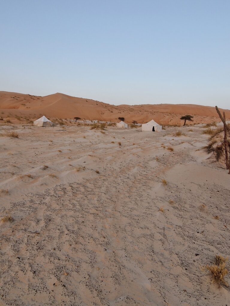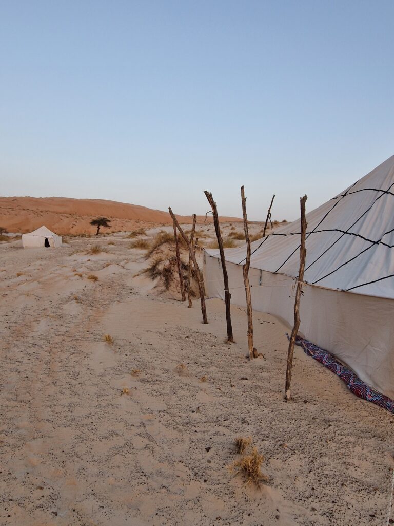 Das Campement besteht aus einem grossen Hauptzelt für den Yoga Unterricht, Essen etc., und einer und zweier Schlafzelten darum herum. Ausserdem gibt es eine feste Küche wo die Mahlzeiten von einem professionellen Koch zubereitet werden sowie eine kleine Dusche/WC -Anlage. Es befindet sich an einem wunderschönen Platz versteckt in den Dünen südwestlich von Chinguetti, der nur zu Fuss erreichbar ist. Es gibt keinen Strom und kein Internet.
